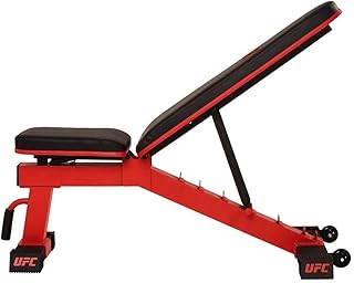 UFC Hantelbank Deluxe FID Bench bis 454kg belastbar. Einsetzbar als Flachbank, Schrägbank, Negativbank und Bauchbank. Rückenlehne 7-Fach verstellbar. Mit Transportgriff u. -Rollen.
