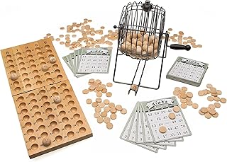 Sport-Thieme Bingo-Spiel mit Bingotrommel | Bingo-Set: Metaltrommel mit Handkurbel, 75 Bingo-Kugeln, 150 Bingo-Chips, 24 Bingo-Karten u. Spielbrett aus Holz | Hochwertig und Robust