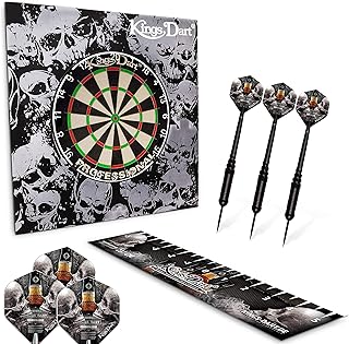 Kings Dart Dart-Set Skull ’n’ Whisky | Dartboard Komplettset: Turnier-Dartscheibe, Dart-Surround, 3X Steeldarts, Flights, Abwurflinie | Für Soft- u. Steeldart | ø 45 cm | Markenqualität