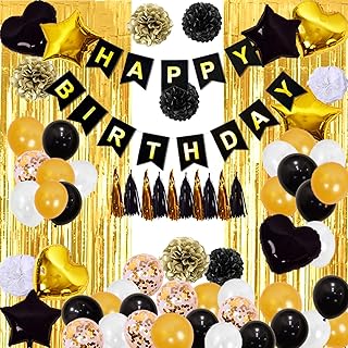 Ohighing Happy Birthday Schwarz Geburtstag Party Deko Set 1 Girlande 6 Pompoms 16 Luftballons Schwarz Gold Ballons Gold Konfetti Luftballon(ca.30cm) 1 Happy Birthday Banner in Gold metallic