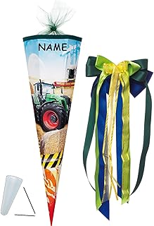 alles-meine.de GmbH stabile Spitze - aus Kunststoff - für Schultüte - Traktor / Mähdrescher - 22 / 35 / 50 / 70 / 85 cm - incl. Namen und große Schleife - Zuckertüte ALLE Grö..