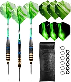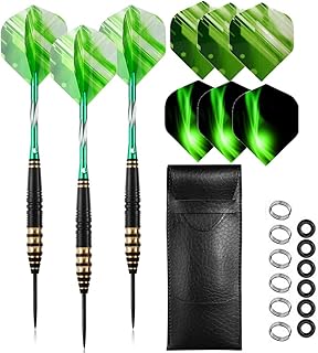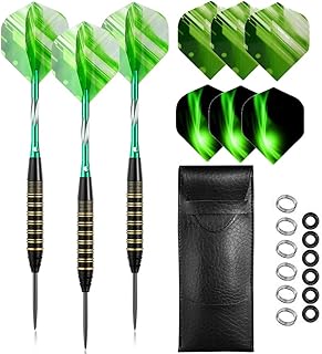 sanfeng Dartpfeile mit Metallspitze, 3 Stück 23 Gramm Steeldarts, Steel Darts Pfeile mit Grün Aluminum Schafts 9 Flights,50 Anti-Lose Gummiringe 12 Spring Rings 1 Dart Tool Sharpener