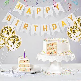Winkwinky Happy Birthday Banner Girlande, 1 Länzenden Geburtstag Girlande und 6 Golden Konfetti Latex Luftballons für Mädchen Jungen Geburtstagsfeier Dekorationen Party Deko Set(Weiß)
